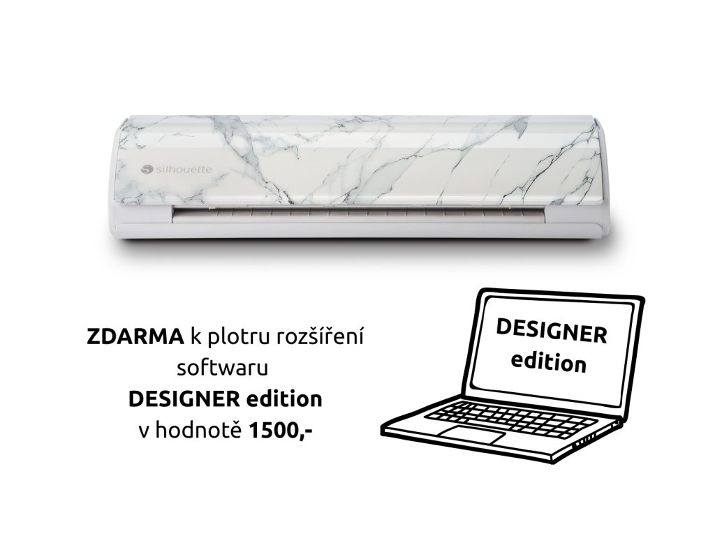 Software Silhouette studio v Designer Edition s rozšířenými funkcemi, např. možností práce s .SVG soubory bez nutnosti převodu na křivky